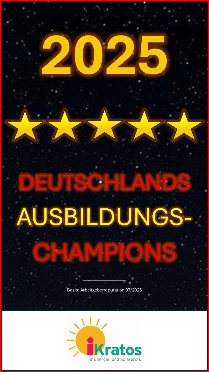 Die Studie "Ausbildungs Champions 2025" des F.A.Z. Instituts und Servicevalue analysiert die Qualität der Ausbildung in zahlreichen deutschen Unternehmen quer durch verschiedene Branchen. Im Fokus stehen dabei Kriterien wie die Zufriedenheit der Auszubildenden, die Qualität der Ausbildungsinhalte, die Betreuung durch Ausbilder und die Karrieremöglichkeiten nach der Ausbildung. Die Auszeichnung von iKratos in der Kategorie Solartechnikanbieter ist ein klares Zeichen für das vorbildliche Engagement des Unternehmens im Bereich der Nachwuchsförderung.