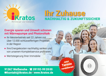 iKratos Solar- und Energietechnik GmbH: Dieses Unternehmen mit Sitz in Weißenohe (bei Nürnberg) bietet Beratung, Installation und Service für Solar- und Photovoltaikanlagen sowie Wärmepumpen an. Sie haben auch eine Ausstellung in ihrem Sonnencafé.