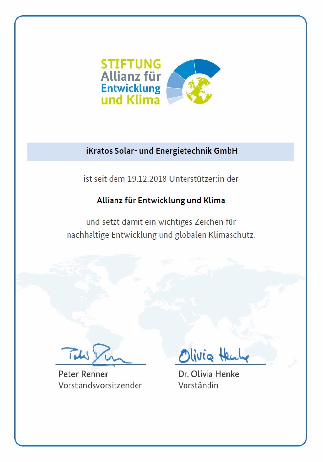iKratos erhält Urkunde von der Allianz für Entwicklung und Klima